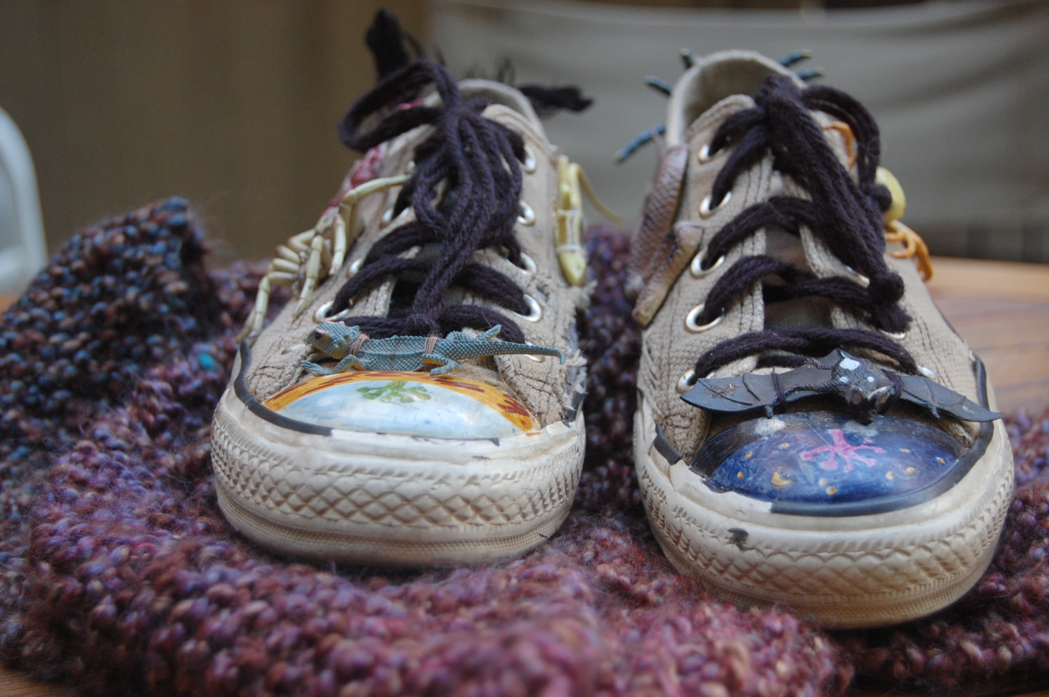 I also made shoes this summer. Well, more that I decorated shoes. In Francesca Lia Block's beloved Dangerous Angels books, the character Witch Baby has a pair of "rubber bug sneakers," so I took it upon myself to make a pair, and here's the result: